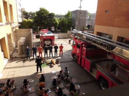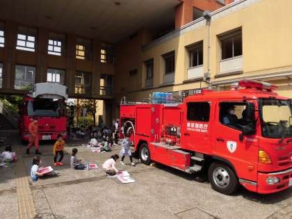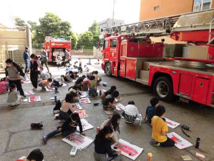 2年生は、はたらく消防写生会を行いました。玉川消防署の消防車を間近に見て、とても迫力がありました。消防士の方もたくさん来てくださいました。大きな画用紙に大きな消防車を描きました。