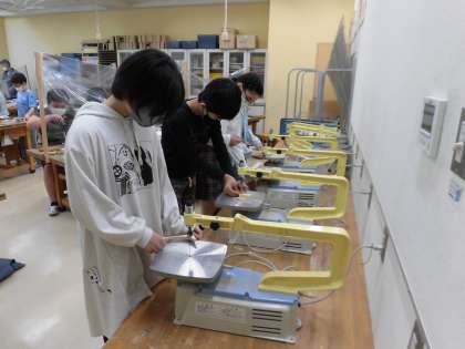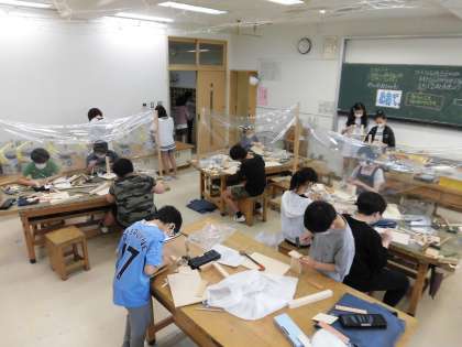 6年生は、図工で木工を行いました。電動糸のこぎり、くぎ打ち等を用いて、木材を組み合わせ立体を表現しました。