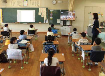 今朝は、校内テレビ放送で音楽朝会を行いました。2年生以外は、教室で、2年生は体育館で「ききゅうにのってどこまでも」の曲を手拍子を交えて歌いました。写真は、いよいよ開始することを待っている様子です。教室では、2年生が歌っている様子をテレビで見ていました。