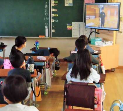 校内テレビ放送で、体育朝会を行いました。内容は、今週から始まる「なかまちランドウイーク」の紹介です。運動委員会の児童が、様々な動きについて説明した動画を放送しました。