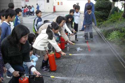 本日30日、生活科の学習で、2年生は世田谷消防署を見学に行きました。係りの消防士の方に消火器の使い方を説明してもらったあと、水消火器で放水訓練をしました。「火事だあ」と大声でさけんで、消火器の水を出しました。「火の用心!」これで火事が起きても大丈夫。