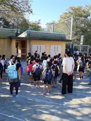 今日は3年生社会科見学です。出発式を校庭で行いました。バスで区内をまわります。