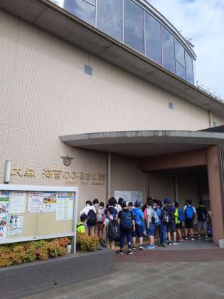 大森海苔のふるさと館に到着しました。これから見学が始まります。施設の前には、広場、海も見えます。