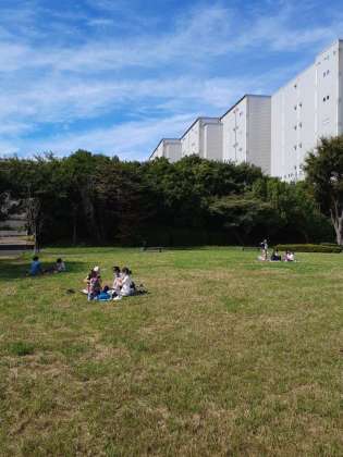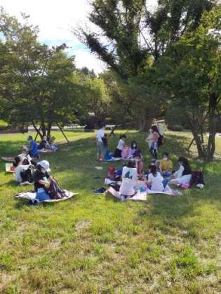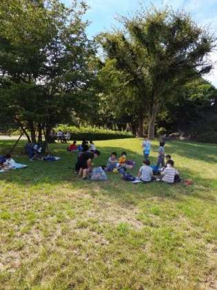 午前中の見学が終わりました。おひさま広場をお借りして、待ちに待ったお弁当タイムです。
