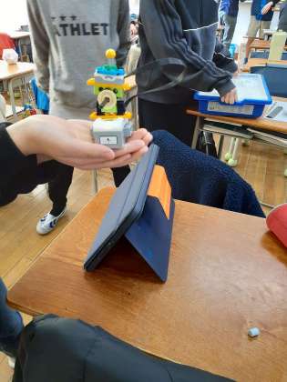 6年生は、プログラミングの授業です。グループで工夫した作品の機能を紹介しています。