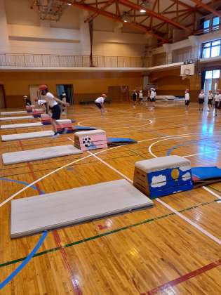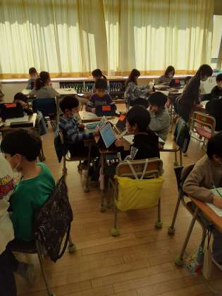 3年生が、総合的な学習の授業で取り組んできた ピオトープ の生き物についてまとめていました。ネット検索しながらワークシートに書いています。別のクラスは、体育の授業で、跳び箱に挑戦していました。