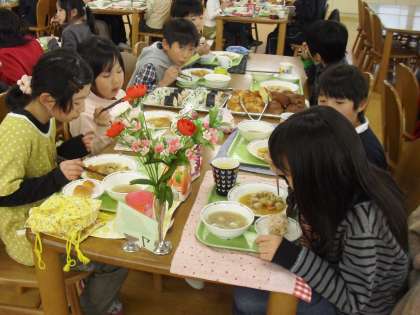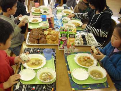 今週は雪もすっかりと無くなり、子どもたちは寒さにも負けず元気に校庭で遊べるようになりました。それにしても寒い日が続きます。学校ではランチルームで交流給食が始まりました。今週は一年生と三年生がいっしょに給食を楽しみました。通常給食のほかに、パン、おにぎり、ジュースがつきます。たくさんのニコニコ顔が見られました。