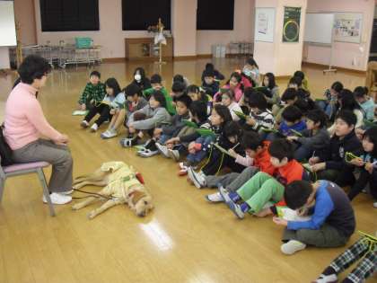 四年生は2月9日(木)の3時間目に、盲導犬ユーザーの方との交流会をしました。授業の流れは、まず小沢さんの自己紹介と日常生活についてお話を聞きました。次に、盲導犬のポップについて教えてもらいました。子どもたちは自分の仕事を忠実に行うポップの姿に感心したり、小沢さんとポップの信頼関係に感動したりしました。最後は、質問に答えていただき、とても貴重な体験をすることができました。保健室の前におひなさまが飾られました。立春も過ぎました。もうじき春がやってきます。