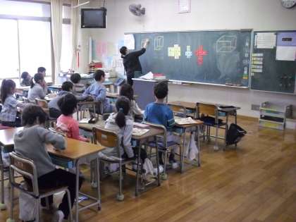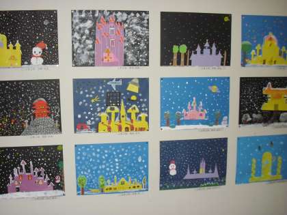 一年生の教室をのぞくと図工でした。楽しそうに何か作っています。ひもを引っ張ると画用紙に描いた動物が糸を登って行きました。作りたいなあ。二年生の教室では算数の学習をしていました。いろいろな箱の形が出てきました。おもしろそうでした。図工室の壁には三年生の「おしろにゆきがふってきた」の絵がはられていました。
