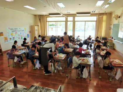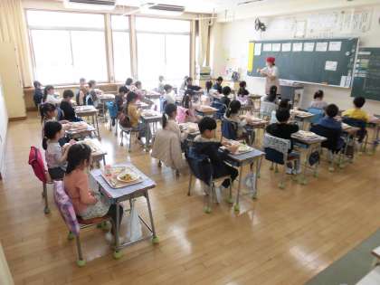 今日から1年生の給食が始まりました。給食当番は白衣を着てとても張り切っていました。支援の先生も特別に多く手伝いに来て、1日目の給食を食べました。メニューはカレーライスです。