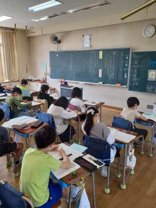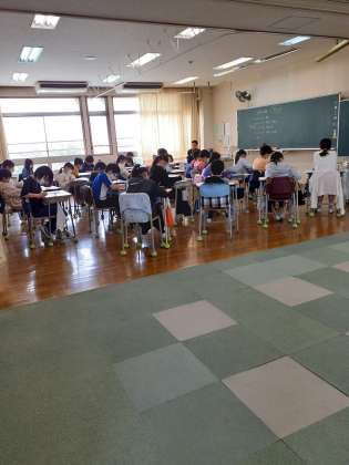 4年生は、国語の物語、白いぼうし の学習です。ワークシートに主人公の気持ちや周りの様子などを書き出しています。6年生は、全国学力学習状況調査で、国語と算数の問題に挑んでいます。