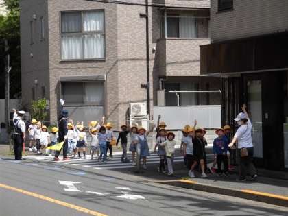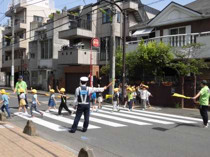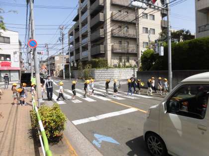 今日は、玉川警察署のご協力のもと、1年生の歩行訓練を行いました。校庭で警察官の方から話を聞き、正門から横断歩道を渡りました。右左右を確認、手を挙げて歩くことを約束して安全に歩行することができました。