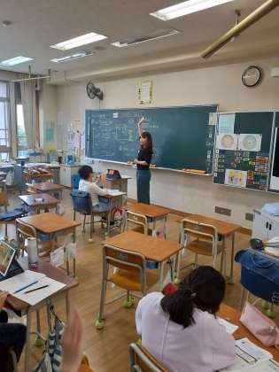 5年生は、算数の授業です。体積の問題について、単位の復習をした後、ワークシートにある問題を異なる計算方法で解いています。図形をどのようにみて式を立てるか、みんなよく考えています。