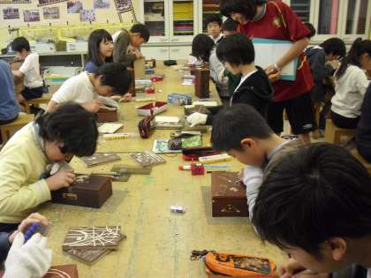 2月24日(金)春を感じさせる穏やかな日でした。インフルエンザは低学年に移り、なかなか終わりません。学校では27日の「こどもまつり」の準備が終わり、いよいよ当日を迎えることになります。また、「6年生を送る会」の準備も盛り上がりを見せています。図工室では6年生が思い出のオルゴール作りに余念がありません。どんな思いで彫刻刀を動かしているのでしょうか。4年生は耳の不自由な方をお呼びして、お話を聞いていました。