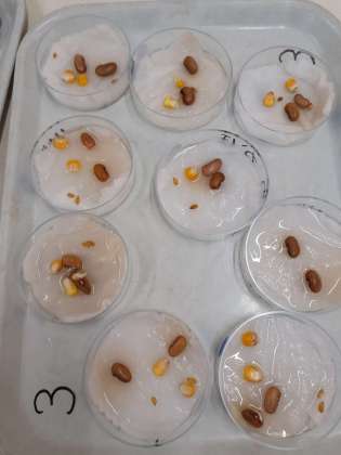 5年生の理科では、植物の成長について種からどのような芽が出て成長していくのか学習します。大豆やとうもろこしの種を、水分を浸した脱脂綿に置いて観察します。算数では、1より小さい数をかけたときの積の大きさを考える学習でした。