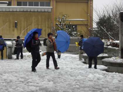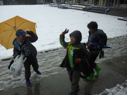 突然の雪が朝から降り続きました。昼になってもまだまだ降る雪。子どもたちはワクワク。校庭は雪が溶けた後にデコボコとなるので遊びは禁止。校舎のあちこちで雪を集めては楽しんでいました。天気予報通り午後には雪も止んでしまいました。この雪いつまで残っているのでしょうか。凍らなければいいですが。