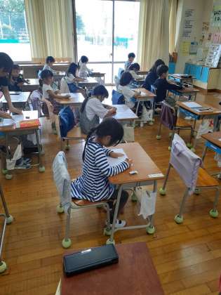 1年生は、算数と国語の授業でした。算数では、しきをぶろっくやまるであらわそう の学習で、4+2=6 に取り組んでいました。国語では、ほ のひらがな練習をしていました。