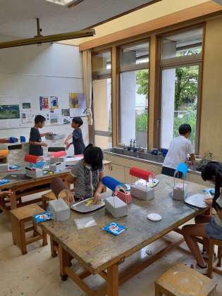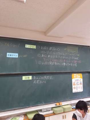 5年生の図工では、オリジナルショップ お店を建設しよう の単元でダンボールや粘土を使ってお店の制作に取りかかっていました。カラフルなお店の屋根に粘土で土台作りなど、一生懸命作っていました。