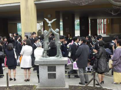 なかたまの学び舎玉川中学校は今日が卒業式。中町小学校から入学した子どもたちもたくさん卒業しました。稲葉校長先生、永井先生が卒業式に参列しました。給食を食べていると、プロムナード(散歩道)のあたりから、ゆずの「栄光の架け橋」のメロディーがドラムやトランペットの演奏で流れてきました。そこには卒業生を送り出す人垣が長く続いていました。小学校の職員も列に入れてもらい拍手を送りました。中町小学校の卒業式は今週の金曜日23日です。
