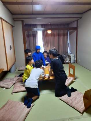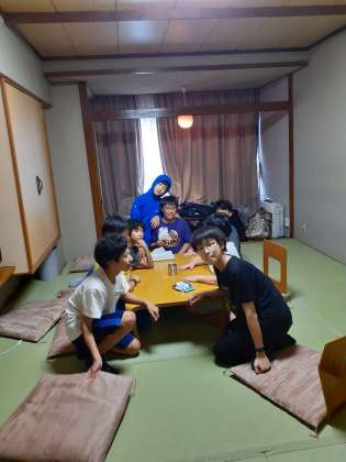 東照宮見学の終わりに、突然の雨、多少濡れましたが無事に春茂登さんに到着しました。避難訓練をして、部屋に落ち着いたところです。