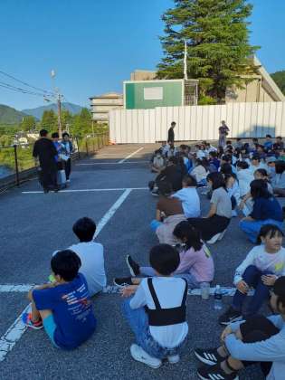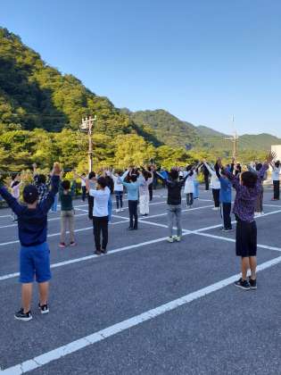 宿から少し離れた広い駐車場で朝会です。ラジオ体操は久しぶりです。
