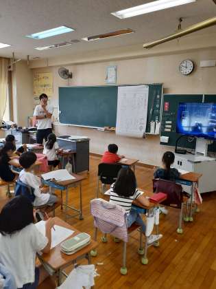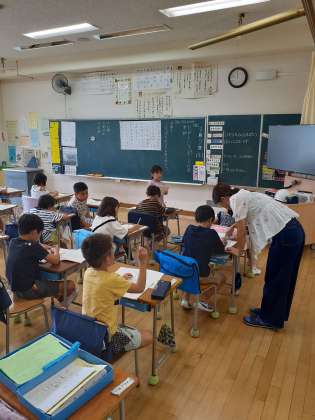 1年生は、ことばあそびの学習です。たて、よこ、ななめにかくれている言葉をみつけます。お友達が作った表から楽しく探していました。2年生は原稿用紙の使い方について学習していました。