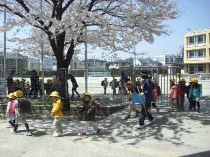 1年生の下校の様子です。今週はまだ給食は始まりません。お昼には家に帰ります。帰りの教室では歌やダンスを楽しそうにしていました。地域ごとに分かれて集団で下校をしています。