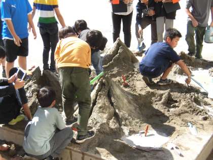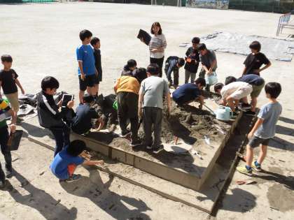 5年生理科では、「流れる水の動き」について学習しました。砂場に大きな山を作り、水が流れる道に、水を流していき、そのようすを観察したり、タブレットで撮影したりしました。