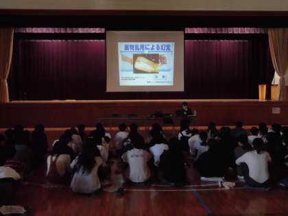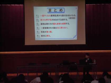 本日は、学校薬剤師の方をお招きし、6年生にむけて「薬物乱用防止教室」を行いました。一度も使用してはならないこと、使用後にどうなるか、オーバードーズについて等、写真を交えて講話をいただきました。6年生児童は、真剣に聞いていました。
