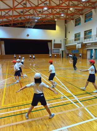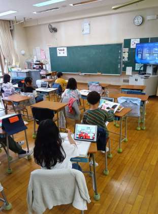 3年生は、体育の授業で元気いっぱい体を動かしています。5年生は家庭科の授業で、家庭科室の道具を調べています。2年生は、消防写生会が雨で外に出られないので写真を見ながら描いています。