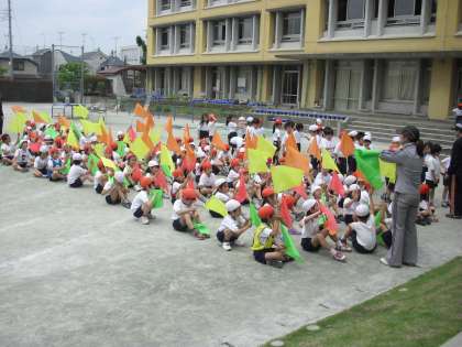 いよいよ26日(土)は中町小学校の運動会です。どの学年も仕上げの段階に入り始めました。1・2年生の演技もきれいな旗をもっておどります。さあどんなおどりでしょう。お楽しみに。全校練習も始まりました。入場、開会式、大玉送り、応援合戦、みんな一生懸命です。天気予報もよさそうですね。