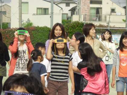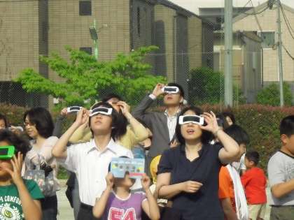 「見えましたか」「見えましたよ」今日の朝の挨拶はこんな調子でしょうか。中町小の校庭には7:30にはたくさんの親子が集まりました。あいにくの雲の切れ間にときどき顔を出した太陽は、どんどんと欠けていき最後はみごとな金の輪に見えました。あちこちで歓声と拍手が聞こえてきました。金冠日食観察会に集まったみなさんは本当に楽しそうでした。このあと会社に行かれたお父さん方も多くいました。刻々と形の変わる太陽に、自然の神秘を感じた子もいたことでしょう。さて6月6日は金星の出番です。見えるかな?