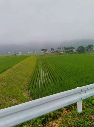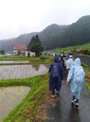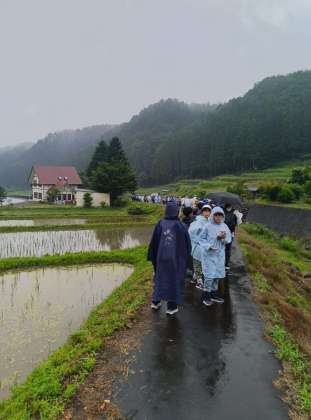 村巡りがスタートしました。小雨の中ですが、田園風景を見ながら村の中をめぐります。