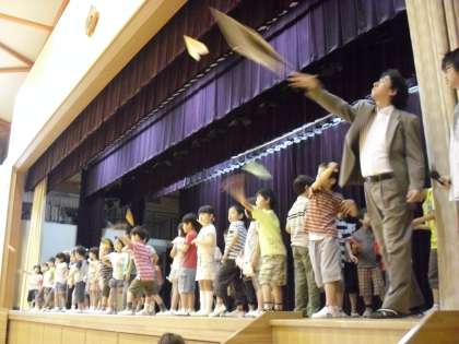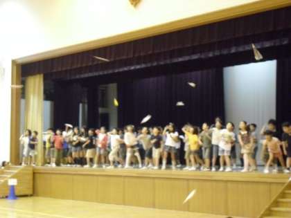 梅雨まじかの今日。児童集会で「紙飛行機とばし大会」がありました。全校児童が手作りの紙飛行機を持ち寄り、体育館の舞台から飛ばしました。一番飛んだのは体育館の後ろ近くまで届きました。すごいですね。五年二組に来ている教育実習生も残すところあと2日。今日は研究授業を行い先生に指導を受けました。きっとよい先生になるでしょう。