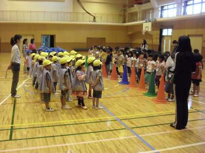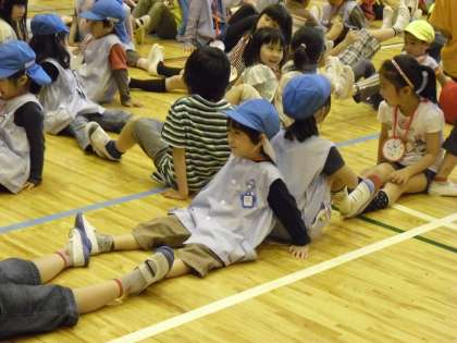今年も、中町幼稚園との交流が始まりました。今日は初めての顔合わせでした。さまざまなゲームをして楽しみました。幼稚園の先生に体を使った楽しい遊びを教えてもらいました。運動会で1年生がやった「チェッコリ玉入れ」もやりました。1年間でたくさんお友達ができるといいですね。