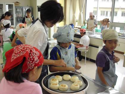 夏休みが始まりました。今年も「夏休みふれあい教室」が行われます。今年は15の教室が開かれます。英語であそぼう、絵本をつくろう、実験してみよう、アロマ工房、囲碁教室など様々な分野の教室が、子どもたちの貴重な体験をさせていただくために、ボランティアで運営していただいています。ありがとうございます。今日は「パン作り教室」でした。みんなでおいしいパンを生地から作り楽しみました。