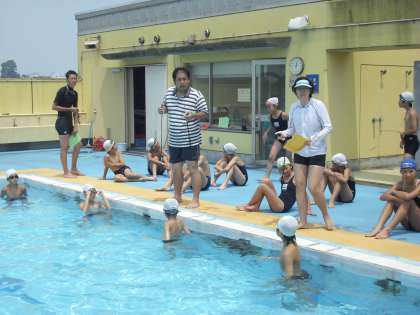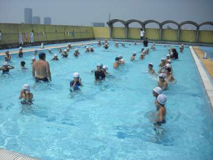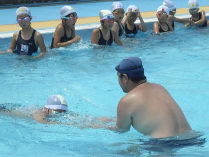 今日も暑い一日となりました。朝プールサイドの気温は29度水温31度でした。屋上のプールは常夏のハワイ?を思わせるようすでした。今日は検定の日。進級できたかな。