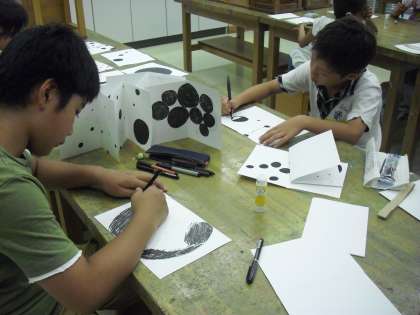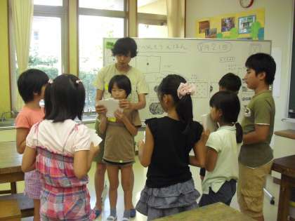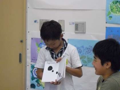 8月の「ふれあい教室」が始まりました。8/21は「えほんをつくろう」です。画用紙を何枚もはりあわせて、ページごとに大きさも数もちがう黒丸を描きます。それをもとにしてお話を作ります。大人には予想もできないお話がいくつも出来上がりました。最後に発表会をして楽しみました。梅村さんありがとうございました。
