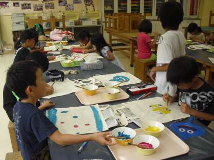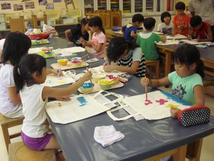 8/28(火)今年最後のふれあい教室は「自分の絵でパックを作ろう」でした。30名程の子どもたちが参加しました。布製のパックに自分の好きな絵を描いて、世界に一つしかないパックの完成です。何を入れようかな。太田さんありがとうございました。