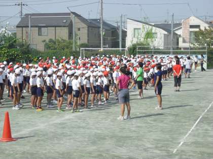 「夏休み作品展」(9/7〜9/13)が始まります。絵や工作、調べ物などさまざまな作品が、ランチルームに展示されています。期間が短いのですが、保護者会のときにでもご覧ください。今年も傑作がたくさんありそうです。今年の水泳指導も残り少なくなりました。5,6年生は10日(月)に水泳記録会があります。応援よろしくお願いいたします。また、来週は「あいさつ運動」週間です。家庭でのご協力もお願いします。今朝は体育集会で「ボール送り」ゲームをしました。まだ、校庭は朝から暑いですが、元気に楽しみました。