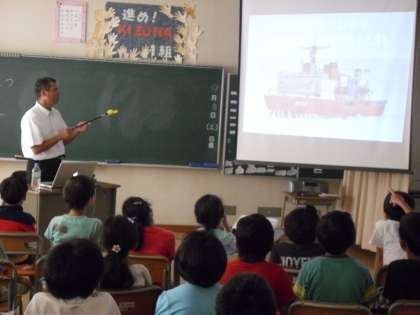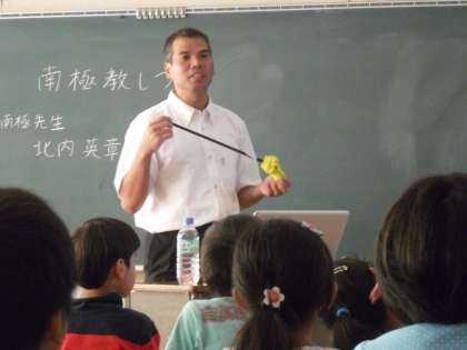 今年も調査員として南極の昭和基地に行かれた北内英章さんに、「南極教室」を開いてもらいました。三年生の児童が驚くようなお話や映像、そして一万年前の氷を持ってきていただきました。南極は宝の宝庫。30万年以上前の地球の気候が分かったり、隕石がたくさんとれたり、不思議な話、おもしろい話がたくさん。氷から溶け出す一万年前の空気の音を聞くこともできました。北内さんほんとうにありがとうございました。