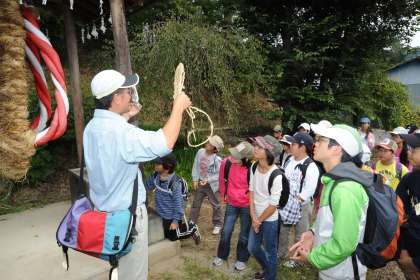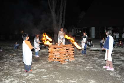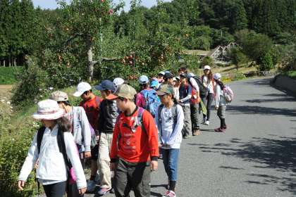 夜はキャンプファイヤー。みんなで過ごす時間が楽しくて、炎が消えかかるまでいつまでもいつまでも踊り続けました。村めぐり。カントリーガイドの案内で川場村を歩きました。特産物のりんごが赤く色づき、りんご狩りを楽しみました。魔よけの大わらじの大きさに驚きました。