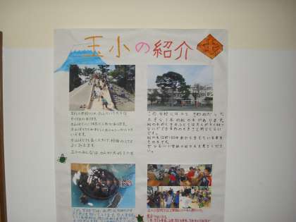 なかたまの学び舎交流で、今日は玉川小学校校長登喜先生が児童会の代表の子と、全校児童の前でお話をしに来て下さいました。玉川小学校の自慢は、百年以上長生きしている松。小学校では小笠原小学校以外で飼われていないというアオウミガメを飼育していること。校庭にある児童に人気の遊び場の力山。それらを大きなポスターにして紹介してくれました。もうじきミニ祭りもあるそうです。うらやましいですね。また、校長先生のお話は、悪い言葉をかけたお米はよい言葉をかけたお米と比べると、すっかり痛んでしまったという、言葉の大切さについてのお話でした。これからも玉川小学校と交流を深めながら、なかよくしていきます。