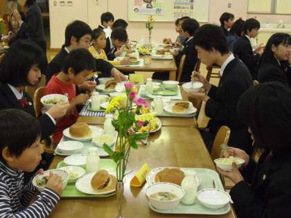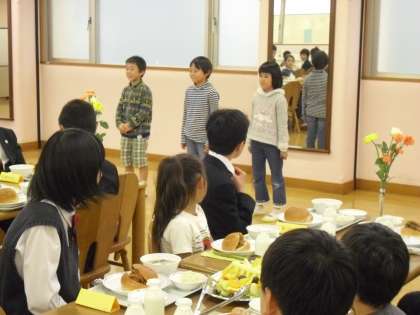 中町小の児童と玉川中の生徒は、毎年全員が給食を一緒に食べることにしています。小学校のランチルームで、クラスごとに一緒に食事をします。交流給食の日は、デザートなどに特別メニューがあり、楽しみの一つです。今日は、チキンハンバーガー、ポテト、ワンタンスープ、それに五種類のフルーツが大皿に盛られていました。10日間で交流を進めます。食欲の秋。小中連携は給食からですね。