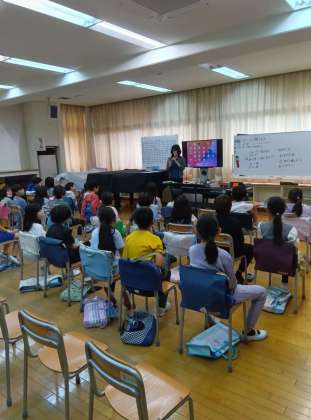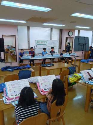 三年生は音楽で、笛の指導を受けていました。二年生は、ランチルームで音楽の授業、ちょうどグループごとに発表していました。