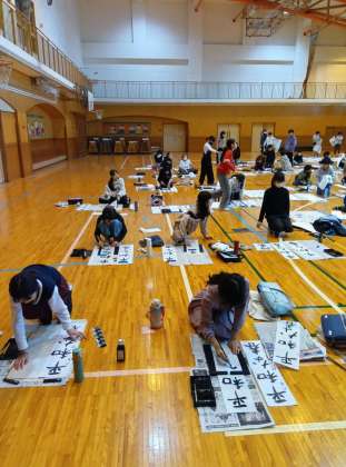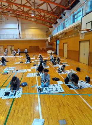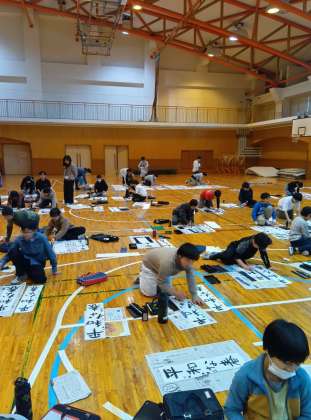 6年生は、書初めの練習で体育館で一斉に書いています。一文字一文字ていねいに練習しています。
