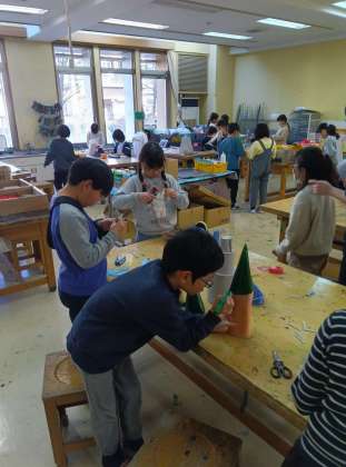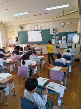 3年生の図工では、 中町タワーを作ろう のお題で工作用紙などを使ってタワーを作製していました。1年生は国語の 動物の赤ちゃん で説明文から読み取る学習をさらに進めていました。4年生は、ソフトバレーボールで、チームに分かれて対戦していました。