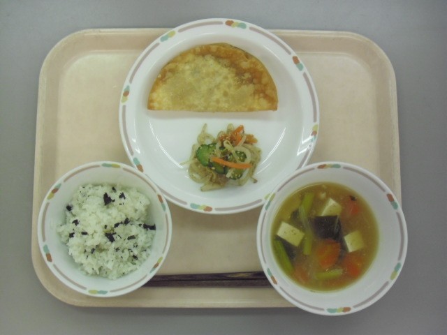 わかめごはん 牛乳 ジャンボぎょうざ 中華風コーンスープ 中華和え