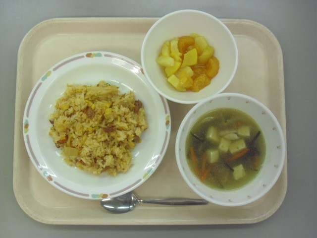 キムチチャーハン 茎わかめの中華風スープ フルーツカクテル