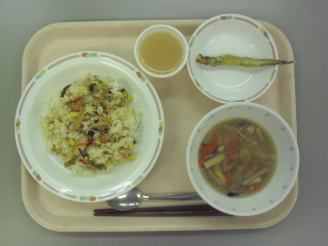 菜の花ずし 牛乳 ししゃものカレー焼き 沢煮椀 ピーチゼリー